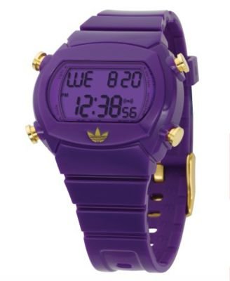 Adidas Purple Polyurethane Strap Watch. Pleasantly purple, proficiently sporty. This fantastic unisex watch by Adidas features a purple polyurethane strap and rectangular polycarbonate case. Logo etched at bezel. Digital dial with timer, alarm, 10-lap memory and date. Digital movement. Water resistant to 50 meters. Two-year limited warranty.